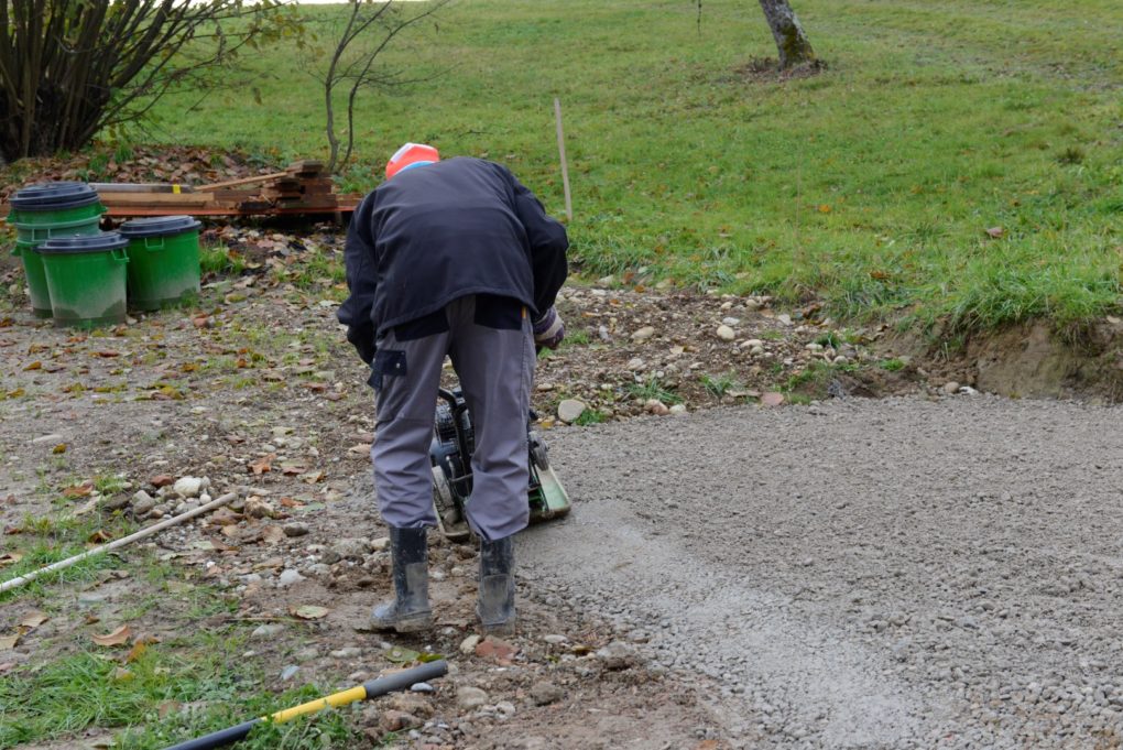 der platz an dem der wohnwagen zu stehen kommt wird in mehreren schichten mit covermaterial bedeckt und mit einer vibrierplatte verdichtet. die oberste schicht besteht aus planierkies.