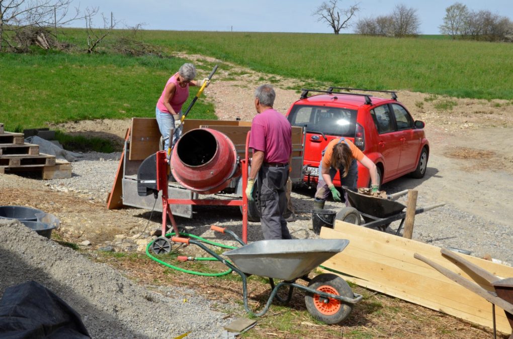 durch diesen schlitz wird beton eingefüllt (über ein gerüst auf einem gerüstbock)