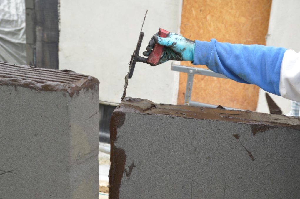 und so werden die schaumglasplatten an die wand gepfeffert. alles was es braucht ist viel kleber der nicht nur auf der wand hält……