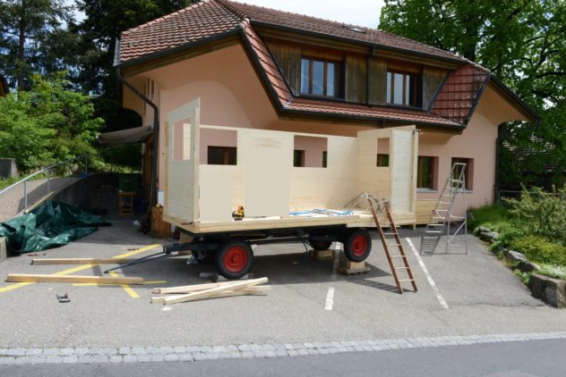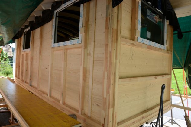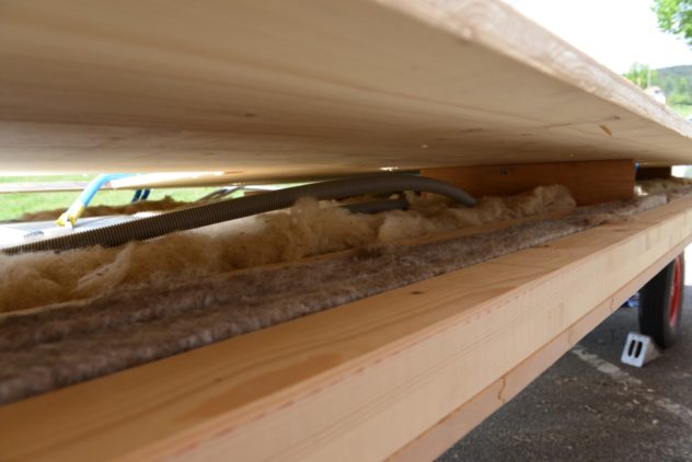 aufbocken mit einer alten stockwinde bodenplatte sandwich. enthält 60mm schafwolle sowie elektro- und wasserleitungen. aufbau von unten nach oben tannenriemen (rauspund) 25mm duo…